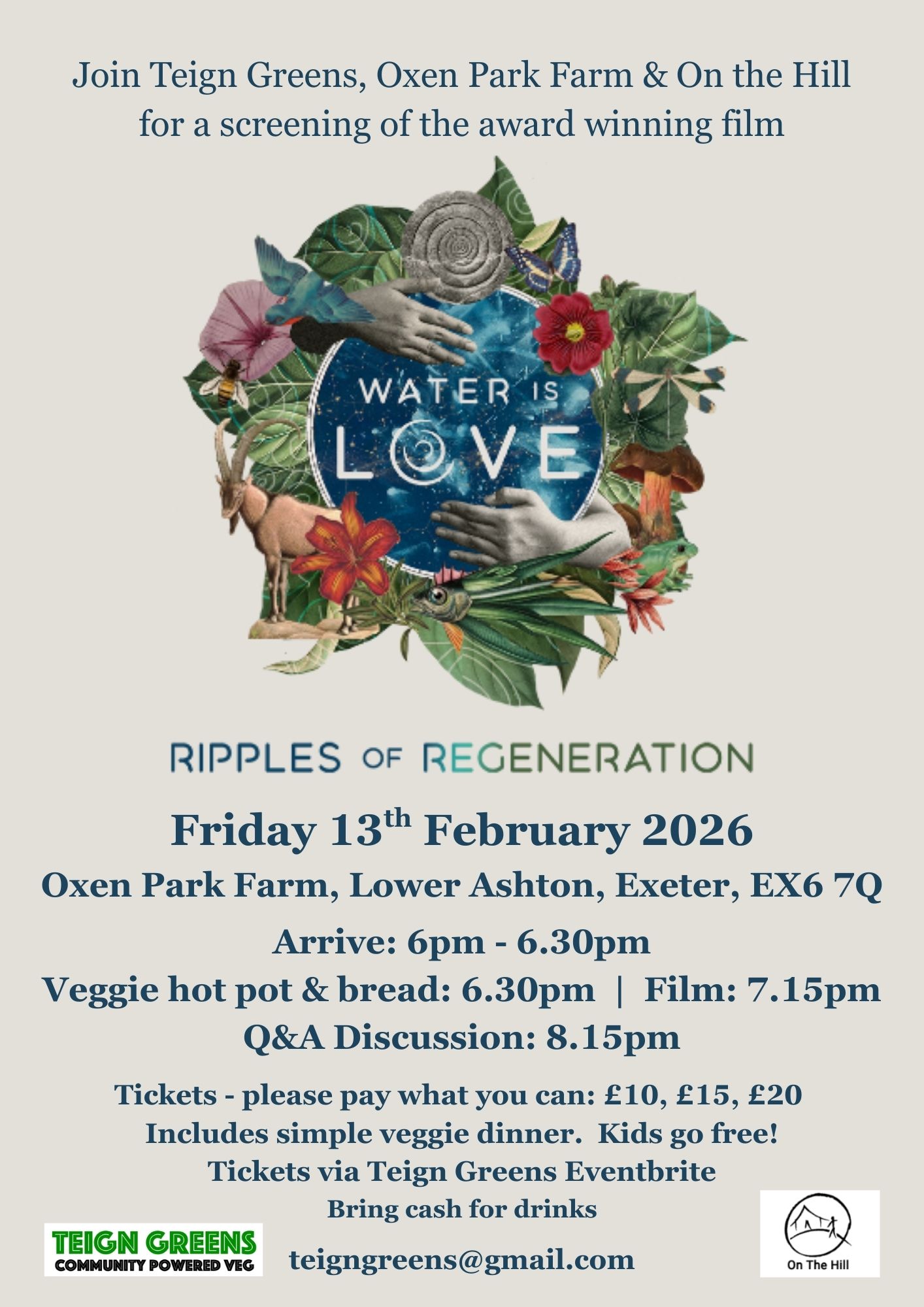 This film offers stories of hope, inspiration and touches upon traditional ecological knowledge, how water makes climate, and the importance of restoring complete water cycles. We are also very fortunate to have Marcus , who is featured in the film, joining us on the night to share some of his own experiences and knowledge of water management and resilience. We'll have a Q&A and discussion after the film, with Jo Clark (Oxen Park Farm & On the Hill), Leonie Flug (Teign Greens), Marcus Dittrich (Oxen Park Farm & formerly Tamera), hosted by Holly Budgen from Teign Greens.